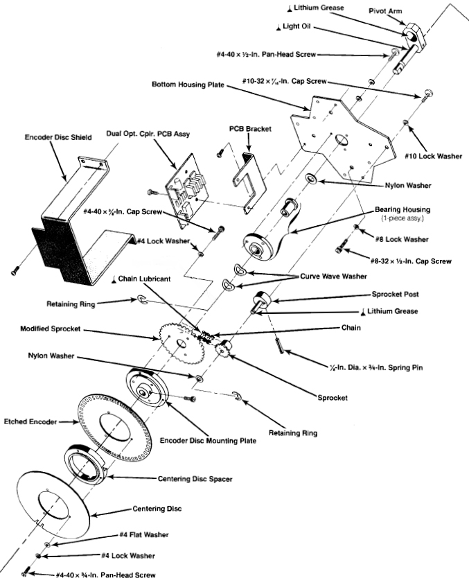 Start by taking off the "encoder disc shield" and the "dual optic coupler pcb assembly". After that, remove the sprocket assembly (below), clean those parts, lubricate the sprocket post with white lithium grease, and put it all back together and set it aside.