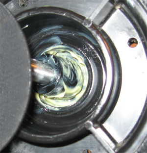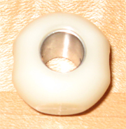 Once the pin is out, take the bushing out and clean it. I used one of my larger taps and gave it a moderate push and it came right out. Clean that bushing, and then put it in your new pivot ball, and then coat the entire ball with white lithium grease. Now that the shaft is free, remove and toss out the old roller and clean the shaft and both sides of the upper housing really well. Insert the new roller and coat it with the grease, and then coat the lower interior of the upper housing (just the areas that the roller will be making contact with). Then put the shaft back through the housing, insert the pivot ball (with the bushing inside it) and align it's holes with the hole on the shaft. Now place the shaft back in the vise, and tap in place the pin that keeps the pivot ball secured: