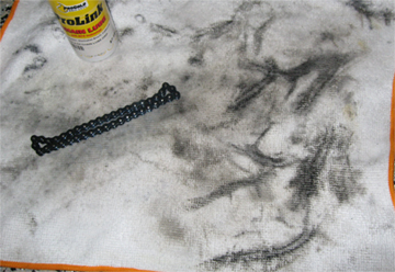 You can now remove the chain and clean and lubricate it. I twice doused and wiped down the chain with a dual chain cleaner/lube, and then applied a final dousing after it was clean and set it aside. The grime that you see on the towel below all came off that chain.