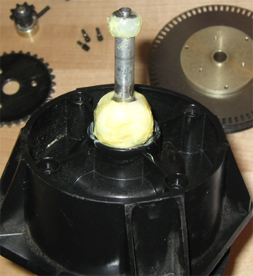 If you have a lower ball to replace do that now. And whether you replace that or not, you need to lube that part and also lube the interior of the "pivot arm" hole (that black piece) with white lithium grease. Be generous with this grease and spread a nice thick layer. The "pivot arm" shaft should be coated with a light oil like machine tool oil (not 3in1 which is heavier). Secure the pivot arm and and reassemble the main housing. Now it's time to put on the disc unit, chain, and sprocket assembly (it's easiest to put them on in that order). Screw in the hex screw that keeps the sprocket post in place but DO NOT tighten it. If you tighten it too much, you won't be able to fine tune the chain and this is critical for smooth and free rotation of the controller.