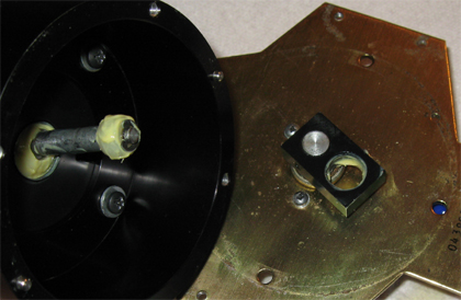 Now take off the etched encoder disc/centering disc unit. NOTE: there's no need to completely disassemble the disc unit. Leave the 3 screws that are on the bottom of the centering disc alone. All you need to do is loosen the 2 hex screws that keep that whole disc assembly secured to the shaft. When handling these discs be gentle and be careful not to drop them as they are very thin and bend pretty easily.
